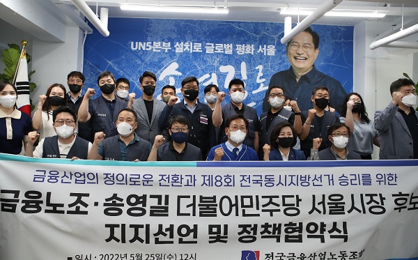 전국금융산업노동조합(금융노조, 위원장 박홍배)는 25일 낮 12시 서울 중구 무교동 송영길 서울시장 후보 캠프 회의실에서 정책협약을 맺고 송영길 후보 지지에 나섰다.