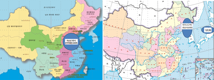 ![]() ▲ 처음 한자인 갑골문을 만든 한나라 이전 동이족이 살았던 하남성 안양시 지역(왼쪽)은 한나라 이후 만주족, 한민족(고구려)이 살았다는 동이족 지역(오른쪽)과 완전히 다르고 시대도 민족도 다르다. © 리대로 |