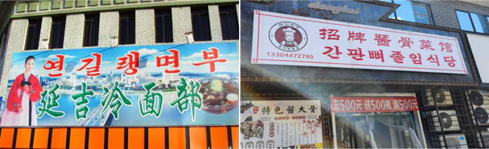 ![]() ▲ 전에 중국 연변에서 한글을 위에 쓰고 한자를 아래에 쓴 간판{왼쪽}이 올해 한자를 위에 한글은 아래에 쓴 간판{오른쪽}으로 모두 한꺼번에 바꾸었다. © 리대로 |