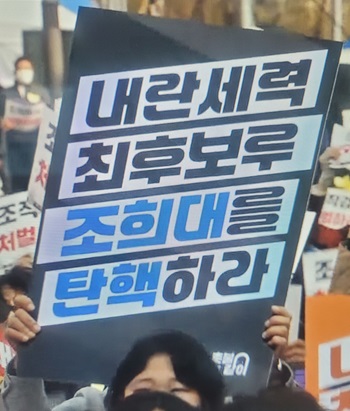 이날 촛불집회 참가자들은 '조희대 탄핵하라' '조작검사 처벌하라' '파병강요 전쟁광 미국을 규탄한다' 등의 손팻말을 들었고 "내란세력 최후보루 조희대를 탄핵하라" "정치공작 회유협박 조작검사 처벌하라" 등의 구호를 외쳤다.
