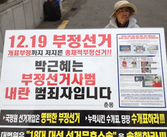 춘몽이라는 예명을 갖고 있는 정휴근 씨는 지난해 12월 27일 이후 5차례 걸쳐 18대 대선무효화를 요구하며 1인시위와 단식 투쟁을 해 왔다.