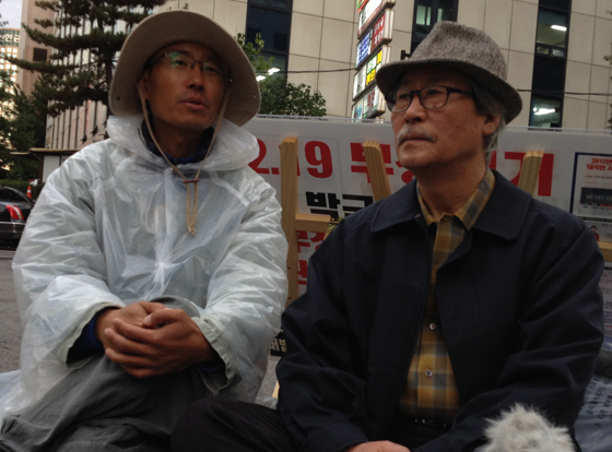 | ▲ 지난 14일부터 새누리당사 앞에서 단식 중인 정휴근씨와 천주교언론지키기모임 이필립 대표. © 김철관 | |