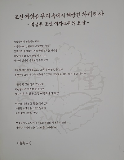 대학본부 2층 계단 입구 벽면에 한일문화어울림연구소 소장으로 할동하고 있는 이윤옥 시인이 쓴 차미리사 선생을 위한 헌정시 ‘조선 여성을 무지 속에서 해방한 차미리사-덕성은 조선 여자교육의 요람-’이 걸려 있었다. 이 시는 2018년 5월 29일 <광복회보> 제14면에 실린 시였다.