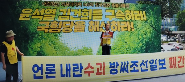 이득우 조선일보폐간시민실천단장이 21일 오후 145차 촛불집회 무대에서 "윤석열 내란 세력에 빌붙어 민주 정부를 헐뜯는 방씨 조선일보를 끝장내야 한다"고 강조했다.